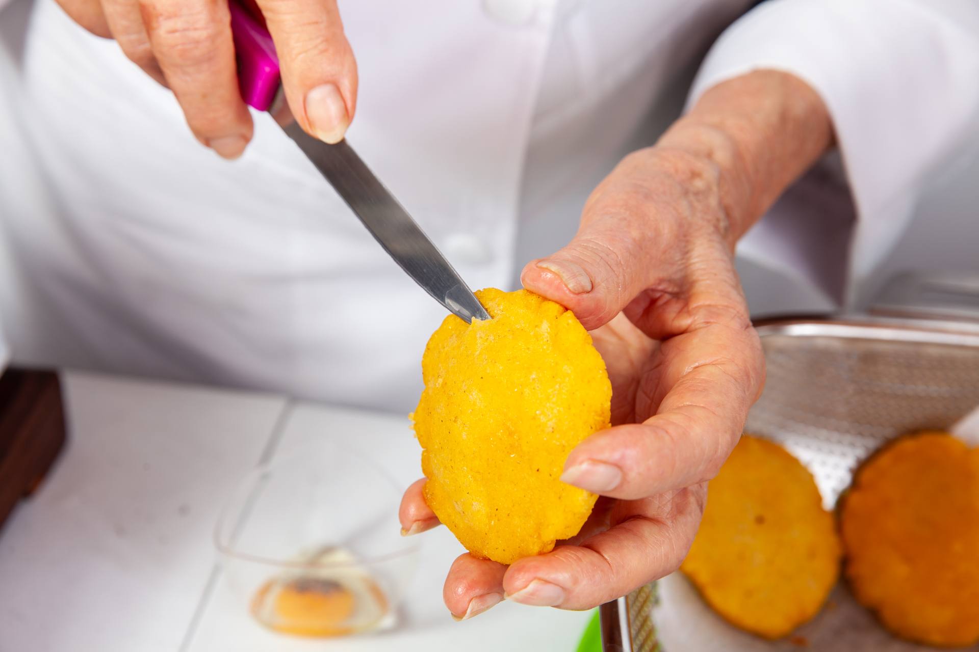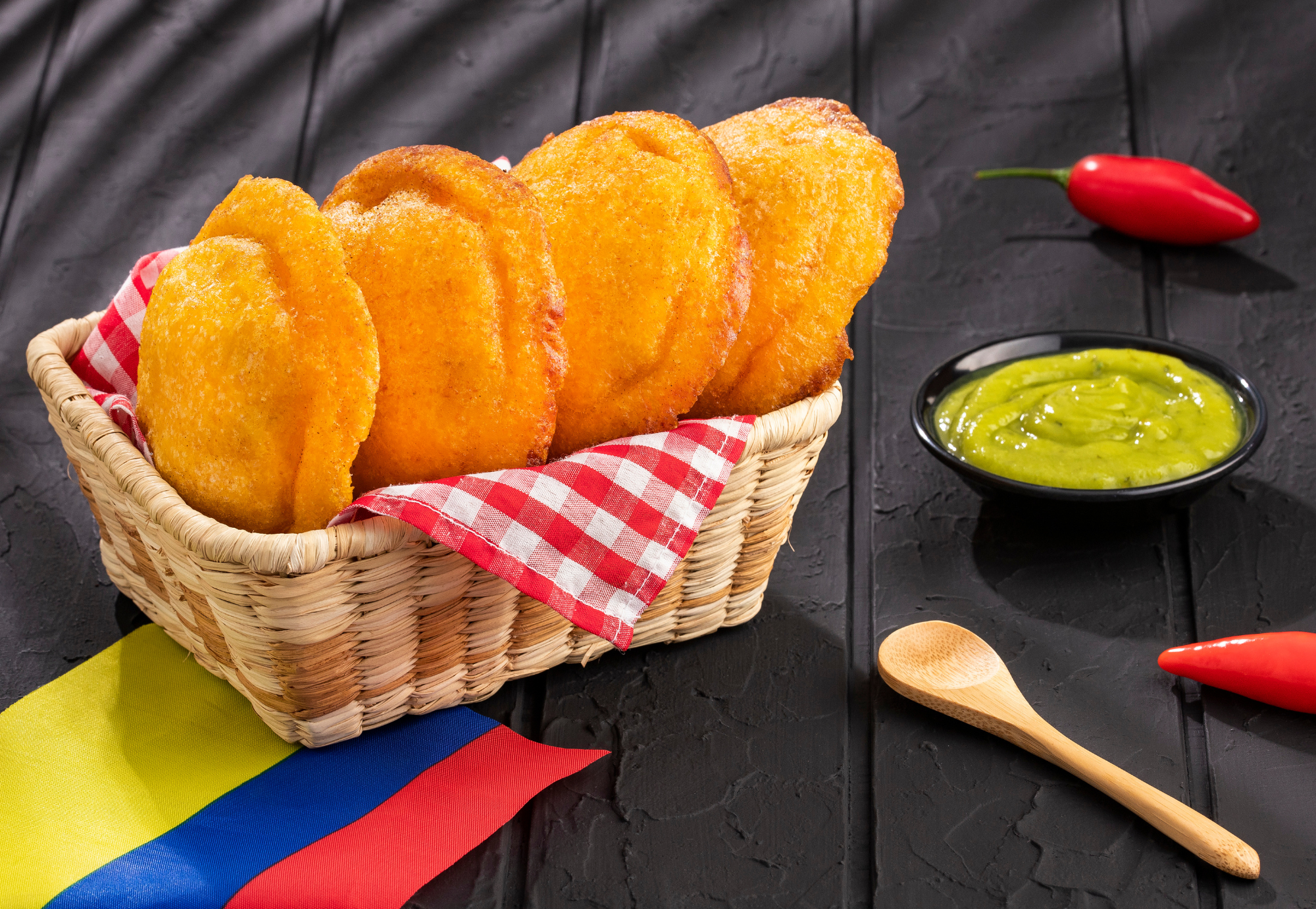 ¡Nuestras arepas rellenas se preparan de forma tradicional! Primero, hervimos y molemos el maíz. Después de amasar la masa, hacemos las tortitas, que luego se asan a la parrilla. Por último, la arepa se abre y se rellena con queso mozzarella, carnes de res o pollo desmechadas, chicharron, trocitos de chorizo, y otros ingredientes según tu elección.